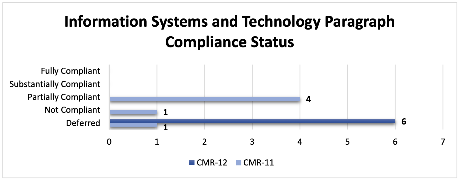 Overall, the Commonwealth's compliance with the six Information Systems and Technology paragraphs has been revised to deferred to accommodate the substantial changes expected from the implementation of Axon and Benchmark Analytics systems. See figure 10.