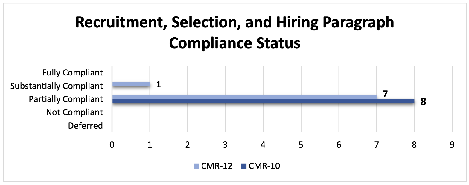 Overall, PRPB's compliance with the eight Recruitment, Selection, and Hiring paragraphs assessed during this reporting period reflect the marginal levels of compliance improvement as what was noted in previous CMRs. In CMR-10, all paragraphs (8 paragraphs) were assessed as partially compliant, in comparison to the current reporting period, where 88% of paragraphs (7 paragraphs) were found to be partially compliant and 12% (1 paragraph) were found to be substantially compliant. See figure 5.