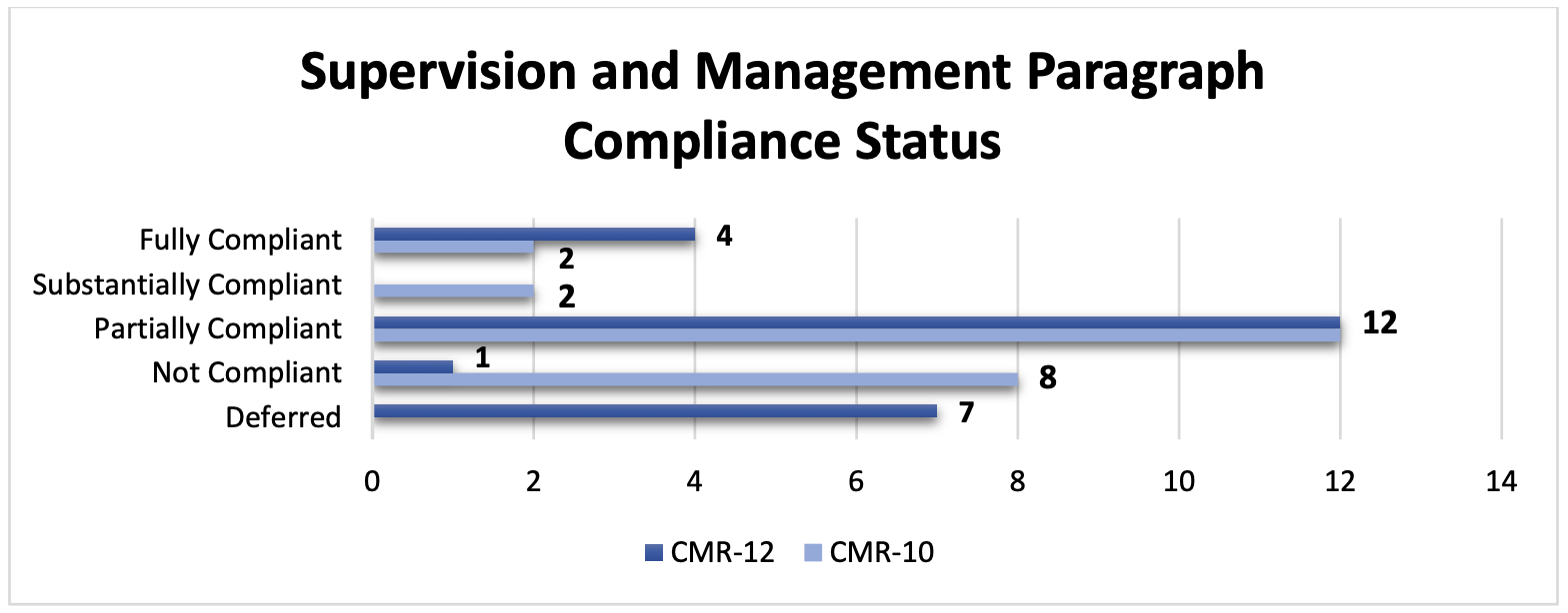 Overall, the Commonwealth's compliance with the 24 Supervision and Management paragraphs assessed during this reporting period reflects similar levels of compliance to what was noted in previous CMRs. In CMR-10, 50% of the 24 paragraphs (12 paragraphs) were assessed as partially compliant and 33% of the 24 paragraphs (8 paragraphs) were assessed as not compliant, in comparison to the current reporting period, where 50% of the 24 paragraphs (12 paragraphs) were found to be partially compliant and 4% of the 24 paragraphs (1 paragraph) was assessed as not compliant. Four paragraphs (17%) were assessed as fully compliant and 29% (7 paragraphs) were assessed as deferred. See figure 7.