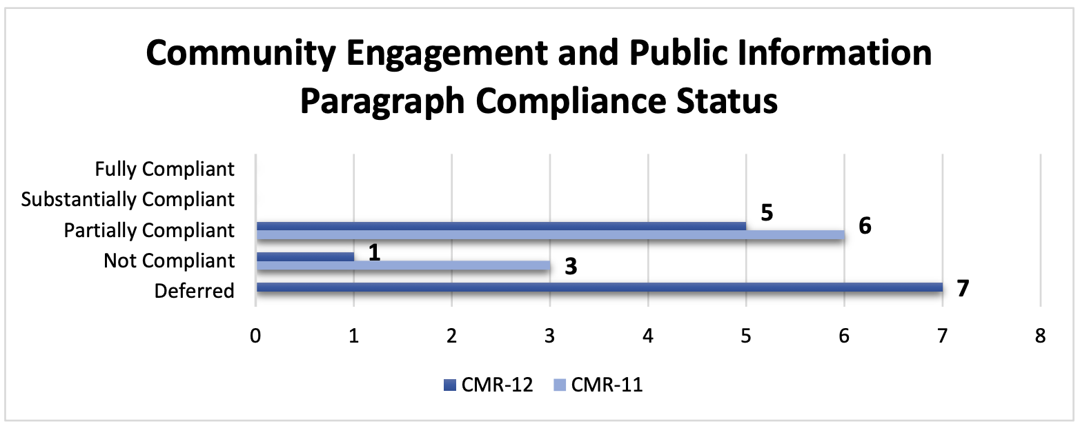 Overall, the Commonwealth's compliance with the 46 paragraphs assessed during this reporting period within Civilian Complaints, Internal Investigations, and Discipline reflects similar levels of compliance with what was noted in previous CMRs. In CMR-11, 57% of paragraphs (26 paragraphs) were assessed as partially compliant and 11% (5 paragraphs) were assessed as substantially compliant, in comparison to the current reporting period, where 54% of paragraphs (25 paragraphs) were found to be partially compliant and 11% (5 paragraphs) were found to be substantially compliant. See figure 8.